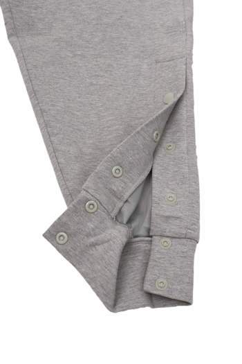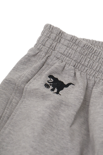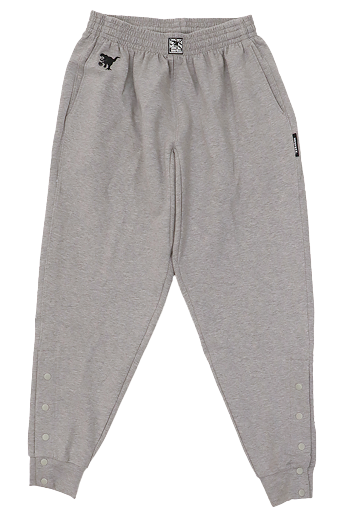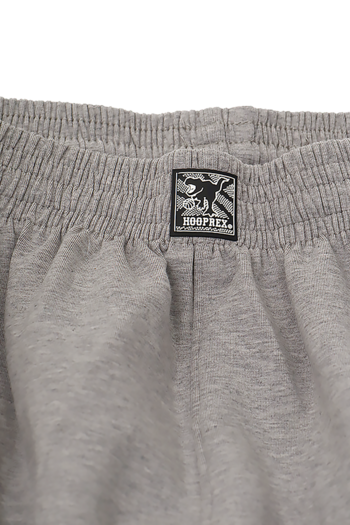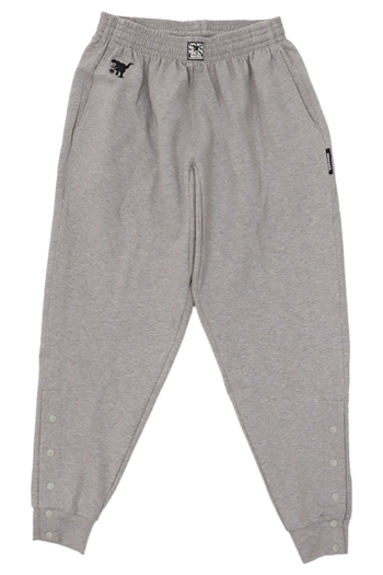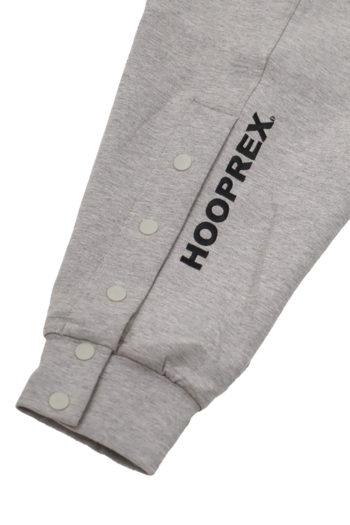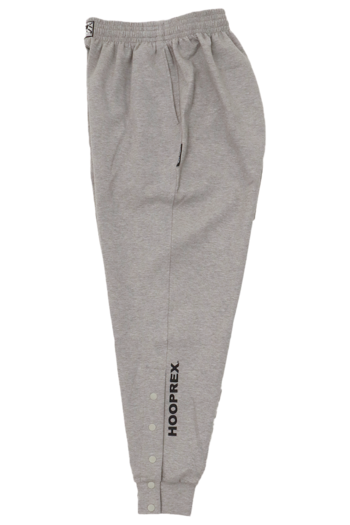 HOOPREXのスウェットパンツ。軽くてハリ感のある素材なのでお手入れがしやすくプラクティスウエアにおすすめ。左裾後ろ部分にプリントが入ったシンプルなデザイン。裾ボタン付きなのでシューズを履いたままでの着脱が可能。お尻~太ももはゆったりめで裾にかけて細身になるテーラードフィットタイプ。