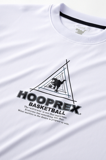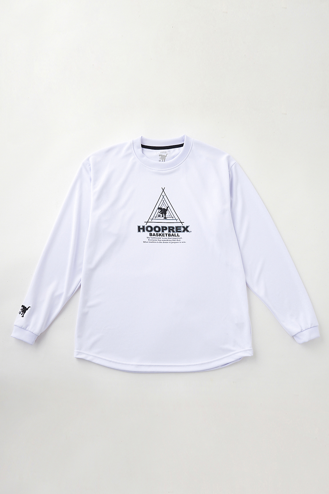 HOOPREXのスタンダードなロングスリーブシャツ。三角形のモチーフとHOOPREXのロゴがデザインされたアイテム。裾のラウンドがスタイルアップに、丈短パンツとの相性は抜群です。