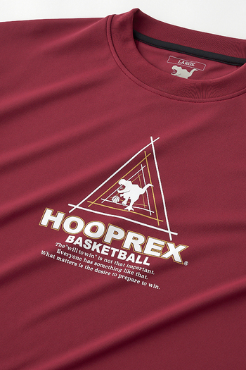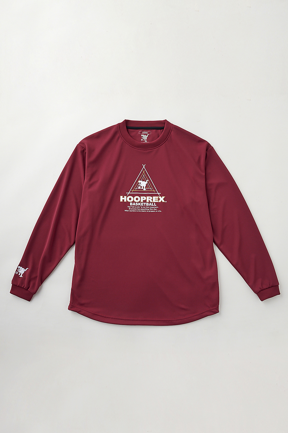 HOOPREXのスタンダードなロングスリーブシャツ。三角形のモチーフとHOOPREXのロゴがデザインされたアイテム。裾のラウンドがスタイルアップに、丈短パンツとの相性は抜群です。