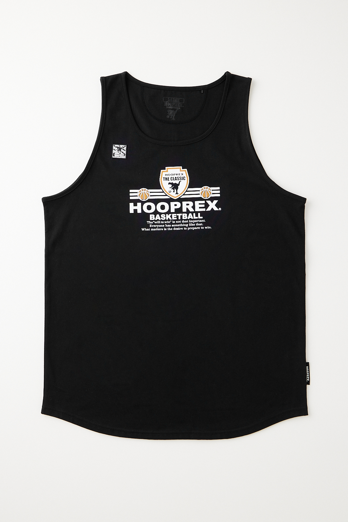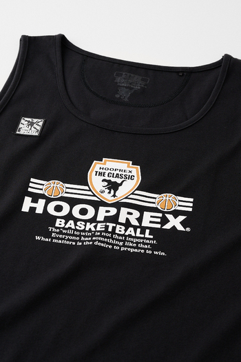 HOOPREXのタンクトップ。HRライクコットンという新素材を採用した綿のような風合いのアイテム。吸水速乾性のある生地は裾をラウンドさせることで身体にフィットし丈短パンツとの相性は抜群。