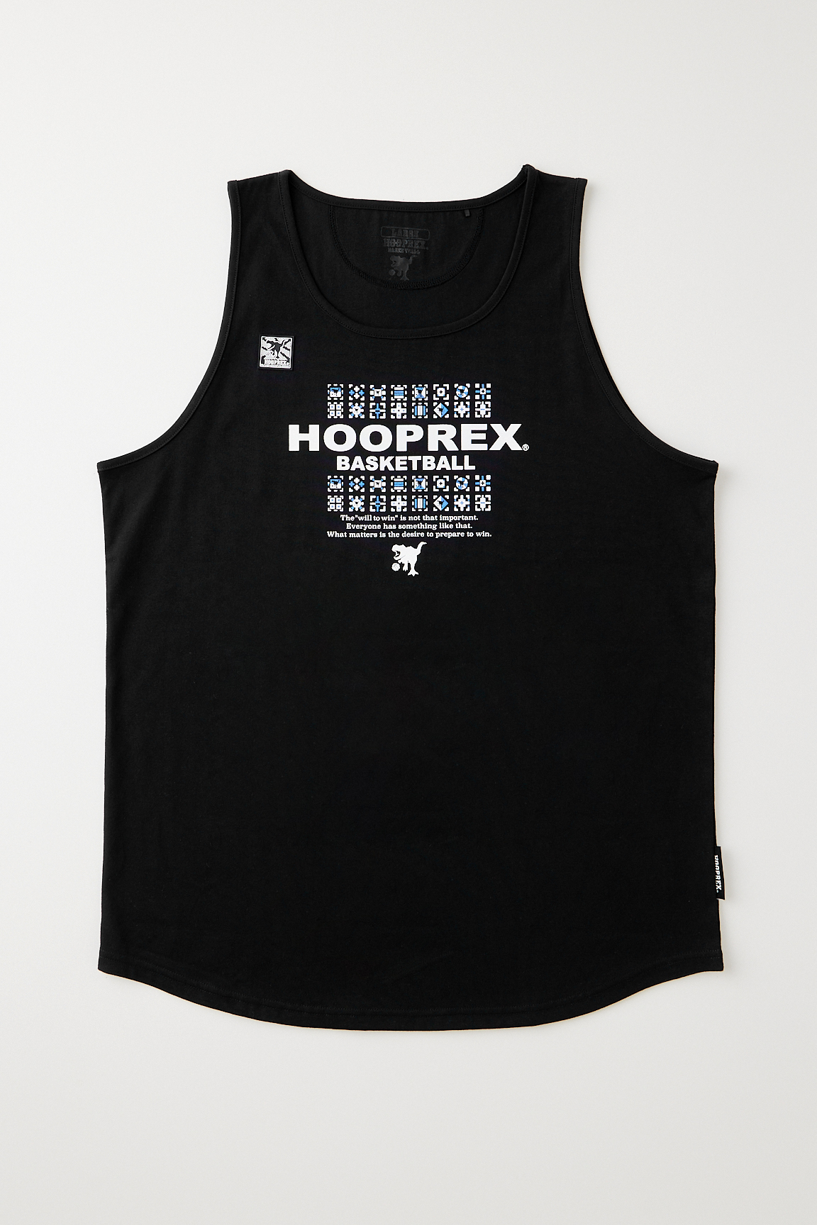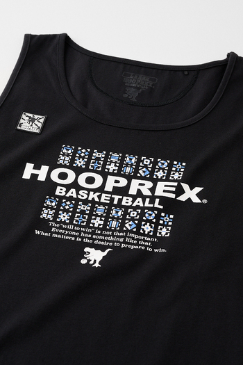HOOPREXのタンクトップ。HRライクコットンという新素材を採用した綿のような風合いのアイテム。吸水速乾性のある生地は裾をラウンドさせることで身体にフィットし丈短パンツとの相性は抜群。■プリントカラーホワイト…ブラック、Dスカイグレー杢…ブラック、Dスカイブラック…ホワイト、Dスカイ■サイズレンジS・M・L・XL・2XL■付属シリコンワッペン(左胸)刺繍(背中首元)ピスネーム(本体左下)