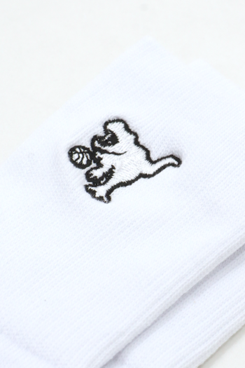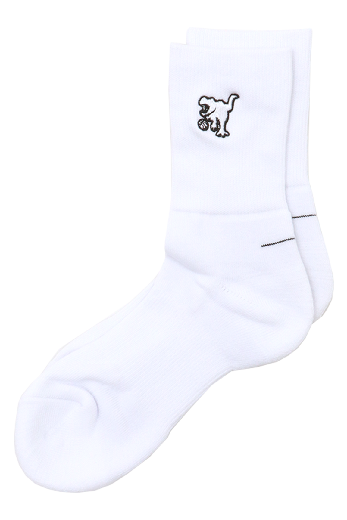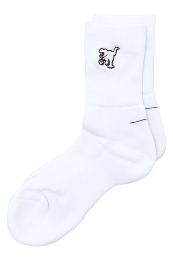 HOOPREXのセミロングソックス(17cm丈)。ワンポイント刺繍加工されたシンプルなデザイン。あみ糸4本取りのボリューム感で足への衝撃を和らげ、つま先の補強糸でほつれを軽減し。アーチ部分のゴム補強による適度な締め付けにより、シューズ内での安定感を増強。吸水発汗糸を使用した高機能ソックス。
