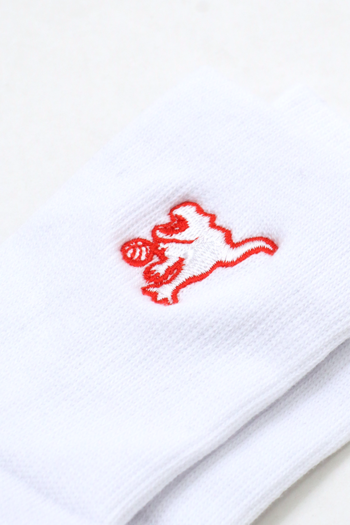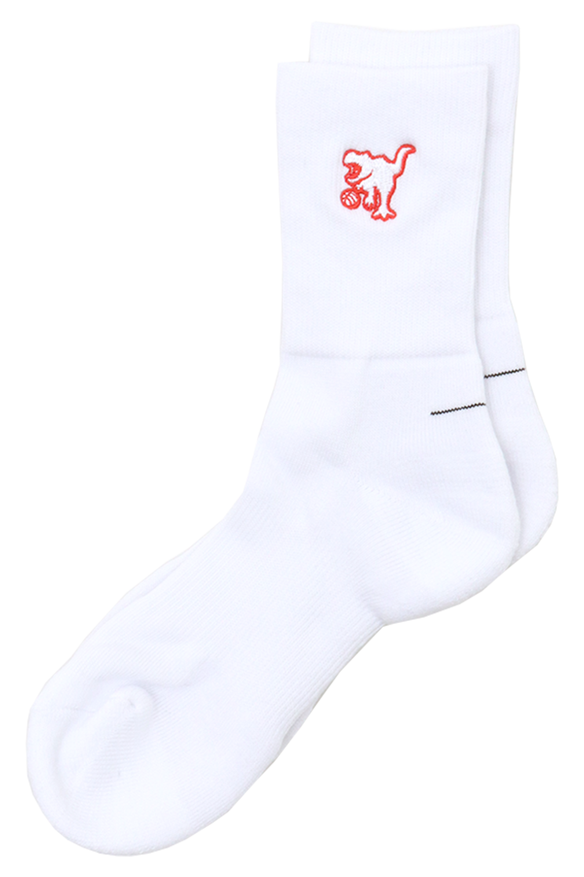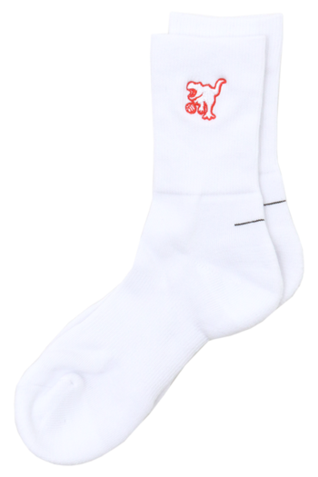 HOOPREXのセミロングソックス(17cm丈)。ワンポイント刺繍加工されたシンプルなデザイン。あみ糸4本取りのボリューム感で足への衝撃を和らげ、つま先の補強糸でほつれを軽減し。アーチ部分のゴム補強による適度な締め付けにより、シューズ内での安定感を増強。吸水発汗糸を使用した高機能ソックス。