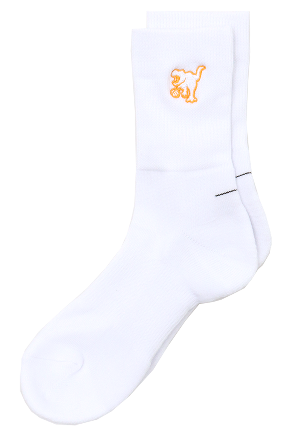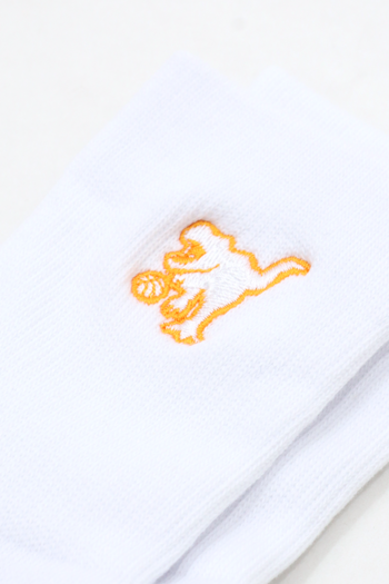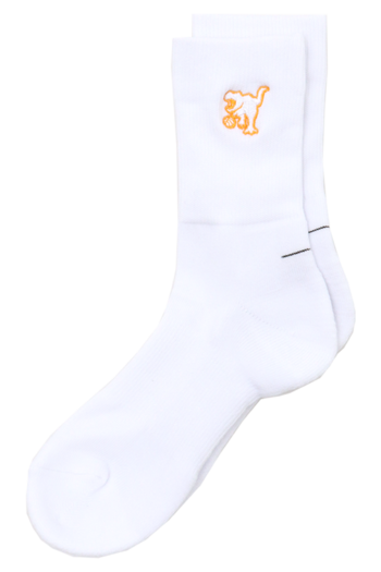 HOOPREXのセミロングソックス(17cm丈)。ワンポイント刺繍加工されたシンプルなデザイン。あみ糸4本取りのボリューム感で足への衝撃を和らげ、つま先の補強糸でほつれを軽減し。アーチ部分のゴム補強による適度な締め付けにより、シューズ内での安定感を増強。吸水発汗糸を使用した高機能ソックス。