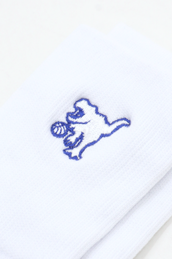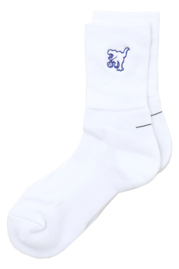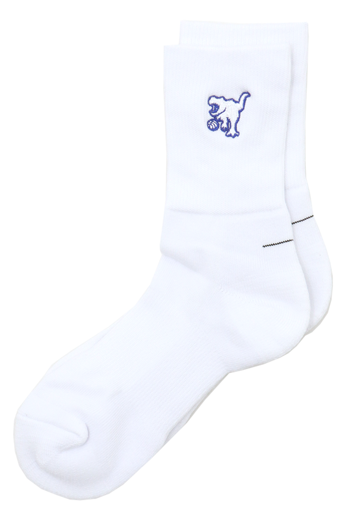 HOOPREXのセミロングソックス(17cm丈)。ワンポイント刺繍加工されたシンプルなデザイン。あみ糸4本取りのボリューム感で足への衝撃を和らげ、つま先の補強糸でほつれを軽減し。アーチ部分のゴム補強による適度な締め付けにより、シューズ内での安定感を増強。吸水発汗糸を使用した高機能ソックス。
