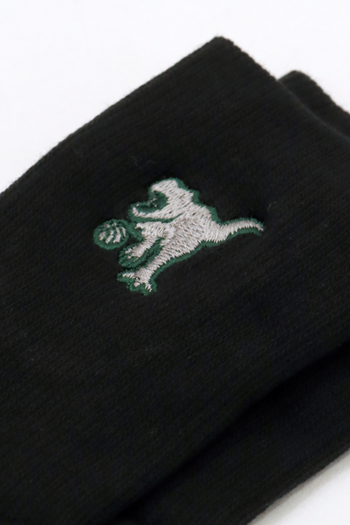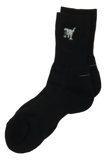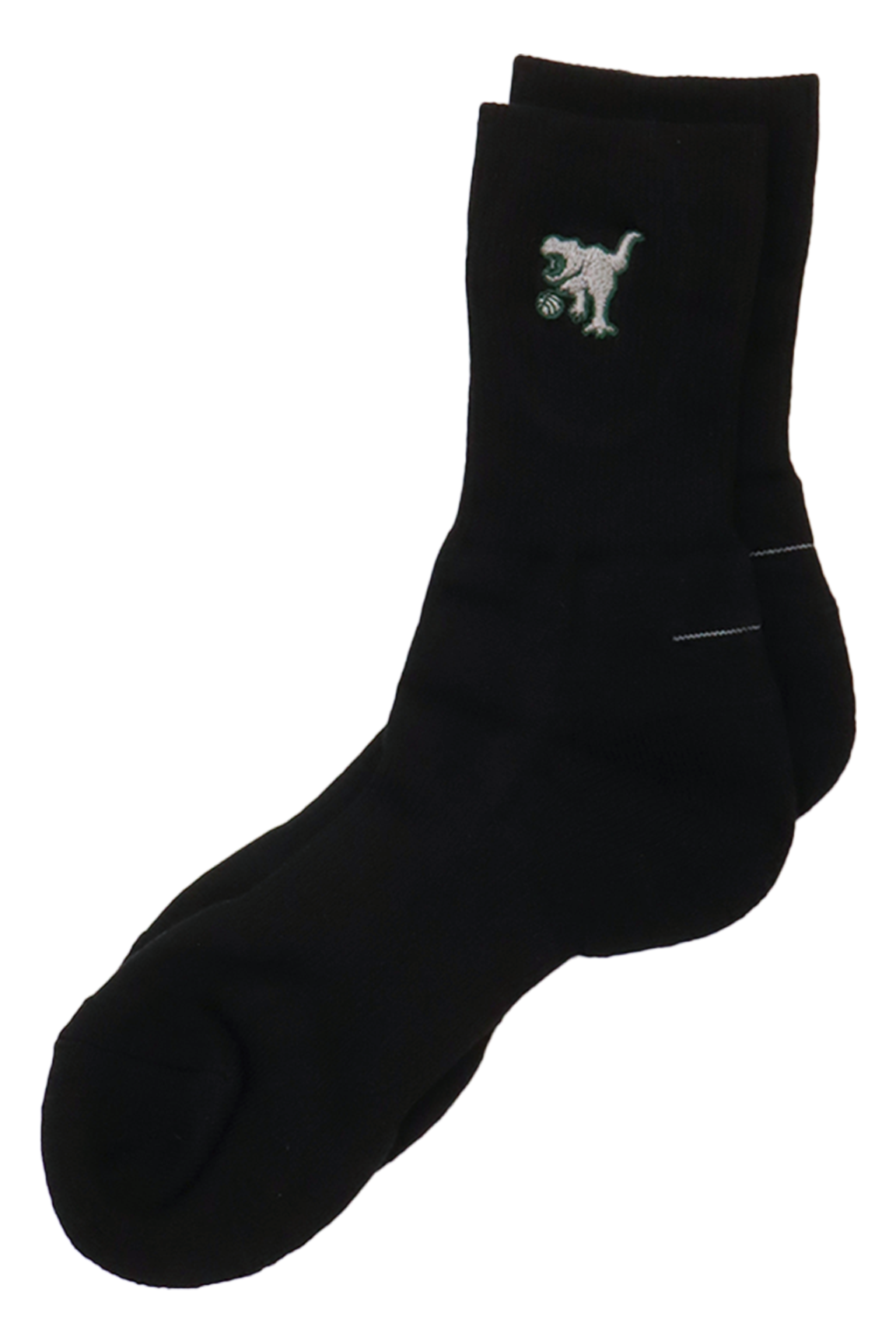 HOOPREXのセミロングソックス(17cm丈)。ワンポイント刺繍加工されたシンプルなデザイン。あみ糸4本取りのボリューム感で足への衝撃を和らげ、つま先の補強糸でほつれを軽減し。アーチ部分のゴム補強による適度な締め付けにより、シューズ内での安定感を増強。吸水発汗糸を使用した高機能ソックス。