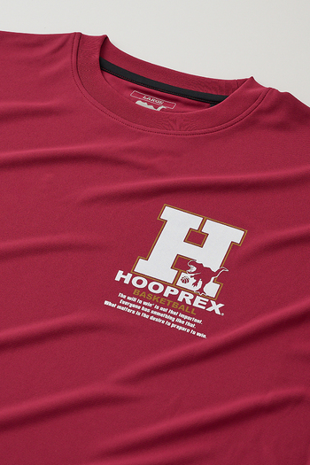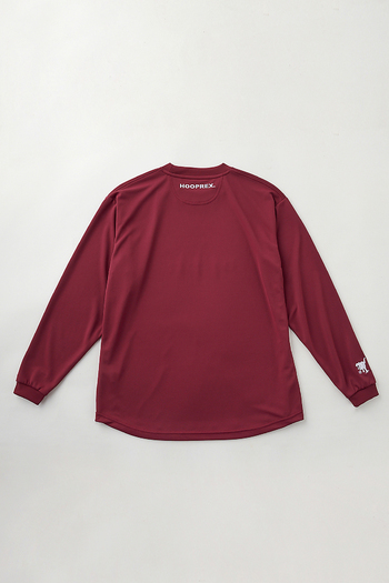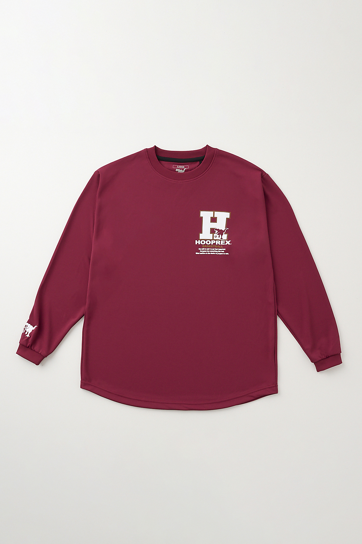 HOOPREXのスタンダードなロングスリーブシャツ。ストライプ柄でプリントされたHOOPREXのロゴが目を引くデザイン。裾のラウンドがスタイルアップに、丈短パンツとの相性は抜群です。