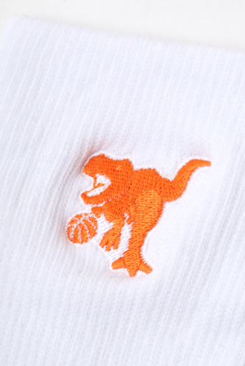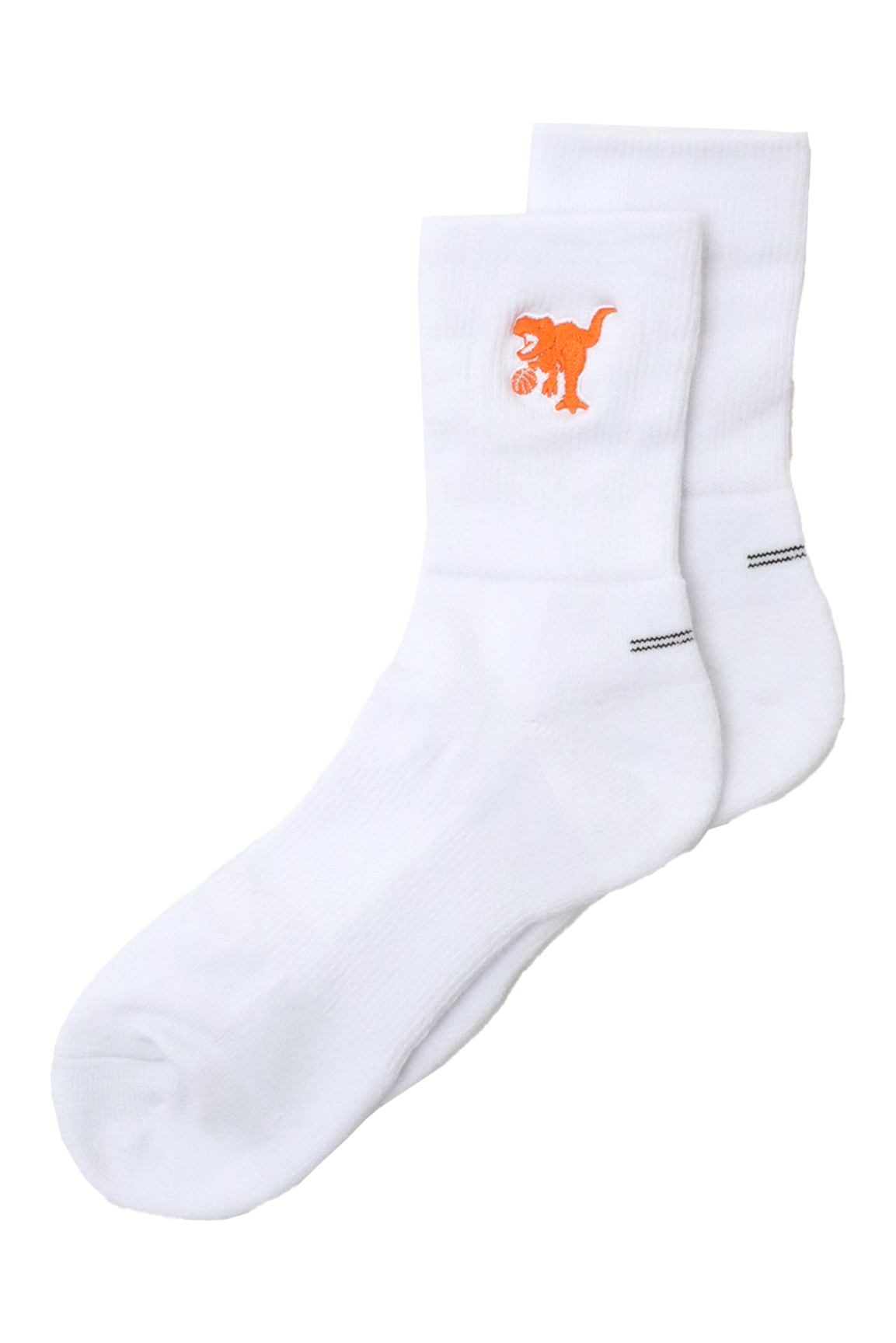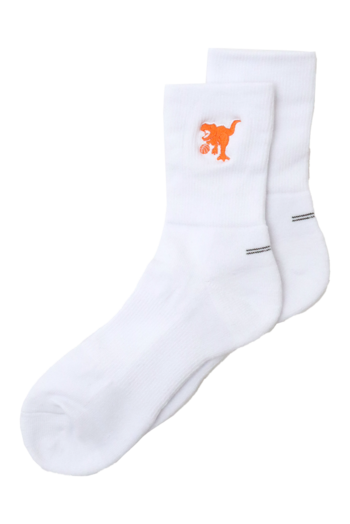 HOOPREXのセミロングソックス(17cm丈)。ワンポイント刺繍加工された全20色。あみ糸4本取りのボリューム感で足への衝撃を和らげ、つま先の補強糸でほつれを軽減し。アーチ部分のゴム補強による適度な締め付けにより、シューズ内での安定感を増強。吸水発汗糸を使用した高機能ソックス。