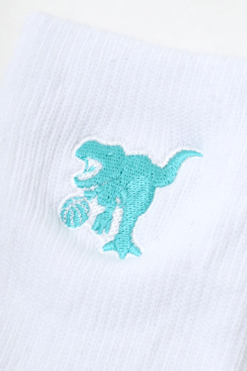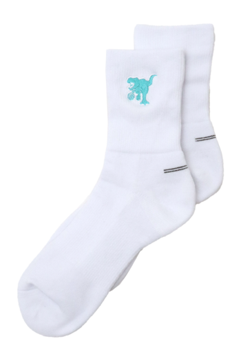 HOOPREXのセミロングソックス(17cm丈)。ワンポイント刺繍加工された全20色。あみ糸4本取りのボリューム感で足への衝撃を和らげ、つま先の補強糸でほつれを軽減し。アーチ部分のゴム補強による適度な締め付けにより、シューズ内での安定感を増強。吸水発汗糸を使用した高機能ソックス。