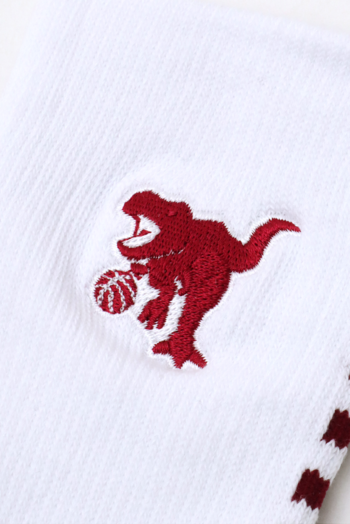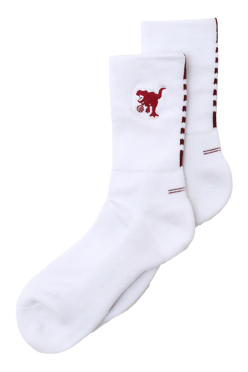 HOOPREXのロングソックス(19cm丈)。ワンポイント刺繍加工された全10色。くるぶしのラインがスマートさを演出。あみ糸4本取りのボリューム感で足への衝撃を和らげ、つま先の補強糸でほつれを軽減し。アーチ部分のゴム補強による適度な締め付けにより、シューズ内での安定感を増強。吸水発汗糸を使用した高機能ソックス。