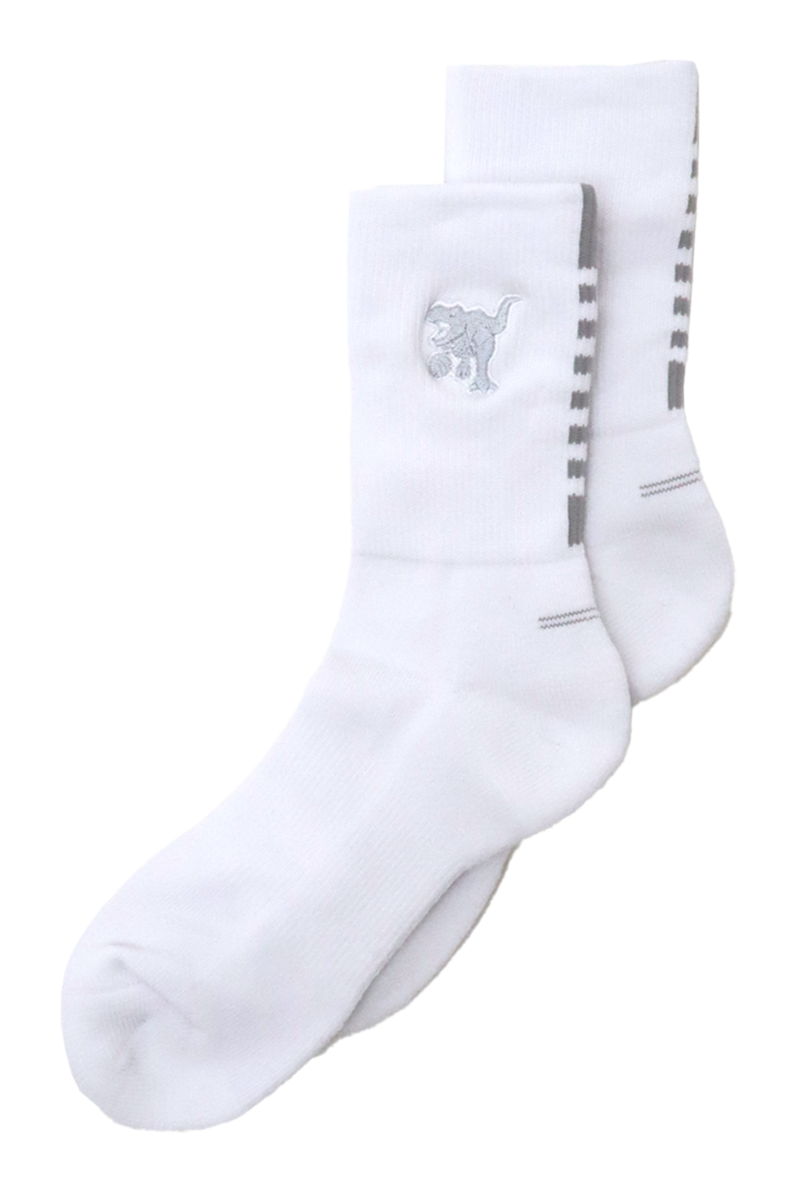 HOOPREXのロングソックス(19cm丈)。ワンポイント刺繍加工された全10色。くるぶしのラインがスマートさを演出。あみ糸4本取りのボリューム感で足への衝撃を和らげ、つま先の補強糸でほつれを軽減し。アーチ部分のゴム補強による適度な締め付けにより、シューズ内での安定感を増強。吸水発汗糸を使用した高機能ソックス。